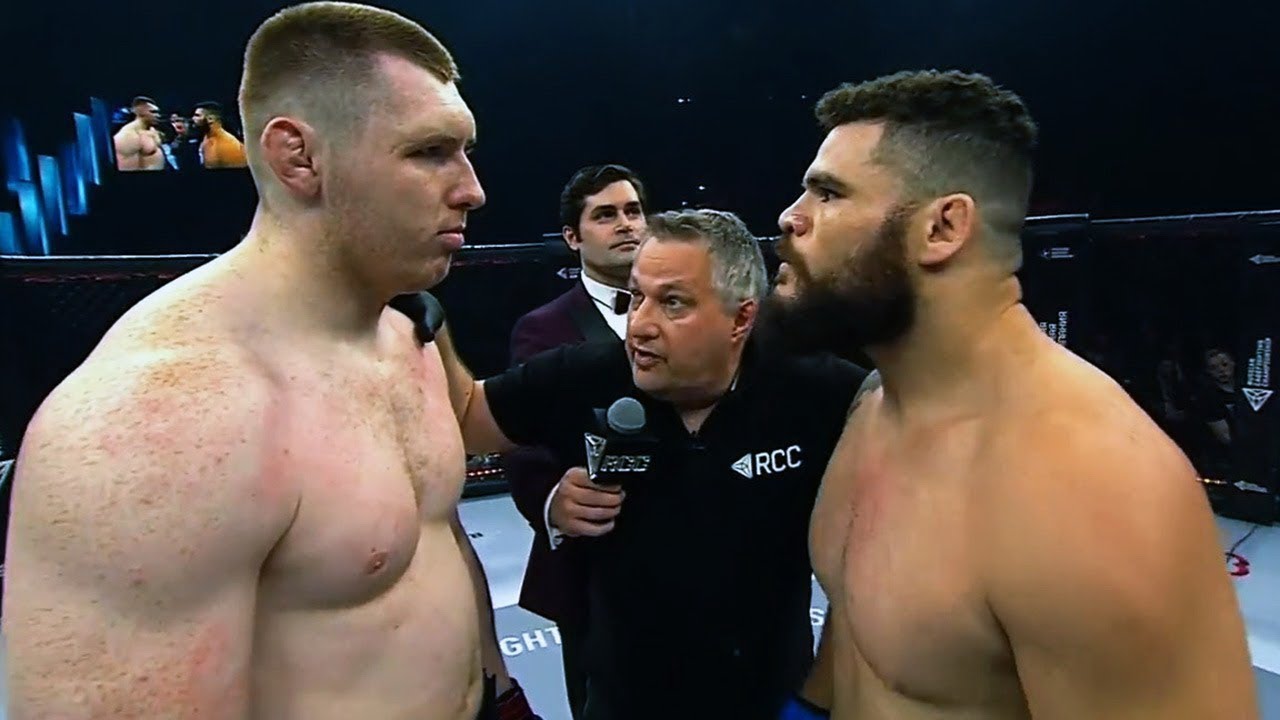 Large russian heavyweight MMA boxer Anton Vyazigin with significant types against brazilian experienced professional athlete and ufc expert Wagner Prado. Fight occurred in Russia. Fight video clip in HD.