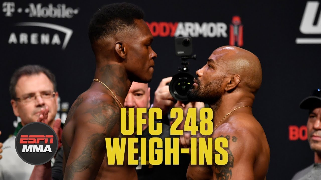 From the T-Mobile Arena in las Vegas, take a look at highlights from the UFC 248 ceremonial weigh-ins, including Israel Adesanya vs. Yoel Romero for the UFC middleweight title as well as Zhang Weili vs. Joanna Jedrzejczyk for the strawweight belt.